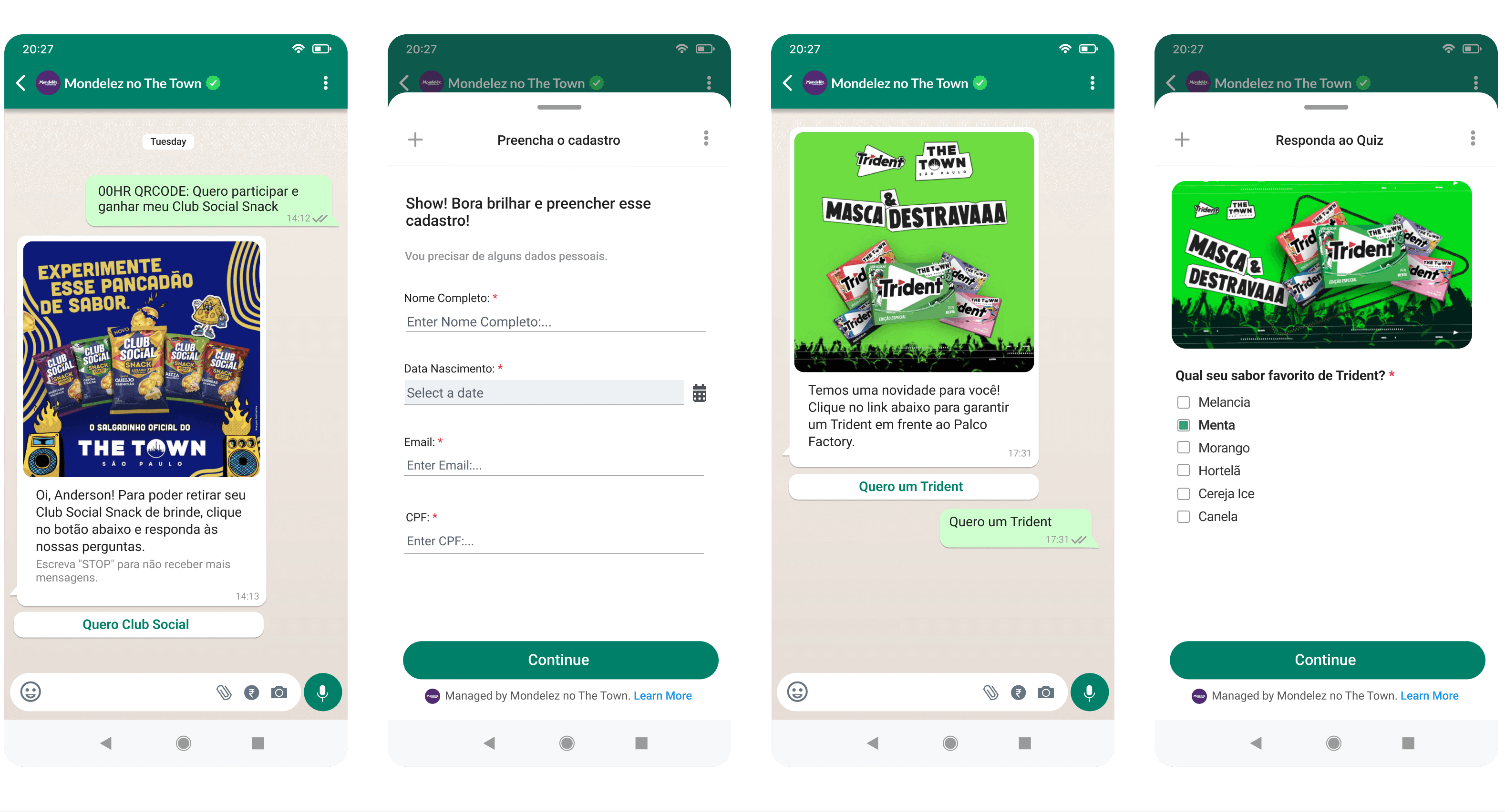 A 360Dialog projetou a estrutura completa do bot do WhatsApp para criar uma experiência fluida de quatro etapas. Após escanear um QR code, os participantes entravam em uma conversa natural, não transacional. Eles respondiam perguntas iniciais, preenchiam um formulário de dados pessoais e então recebiam algo inesperado: uma hora depois, usuários da Trident eram convidados a conhecer Club Social Snack, e vice-versa. Esse convite entre marcas não era apenas marketing inteligente; estendia o engajamento além de uma única interação e apresentava aos participantes produtos complementares que talvez não tivessem considerado.