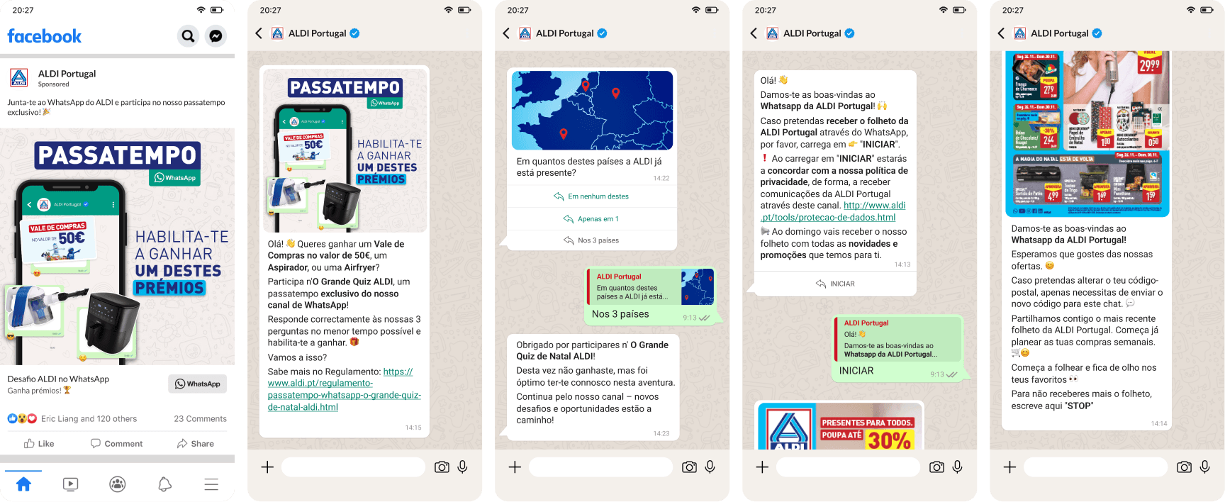 ALDI Portugal arbeitete mit 360Dialog zusammen, um das WhatsApp Contest-Modul direkt in den bestehenden CTWA-Funnel zu integrieren. Statt die Kampagne neu aufzubauen, fügten sie einen gezielten Anreiz hinzu, der die Dynamik vom ersten Klick bis zum Abo aufrechterhalten sollte.